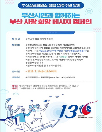 이어 지난 1일부터 오는 10일까지 ‘부산 사랑 희망 메시지 캠페인’을 연다. 이 캠페인은 부산 지역 관계기관과 부산 시민을 대상으로 부산 발전과 기업 성장을 염원하는 희망 메시지를 접수하는 것이다.
