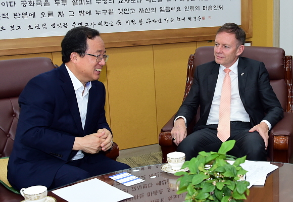 지난 4일 오후 부산시교육청을 방문한 필립 터너 주한 뉴질랜드 대사와 김석준 부산시교육감이 대화하고 있다. 이날 김석준 시교육감은 시교육청을 방문한 터너 대사와 한국-뉴질랜드 간 교육 교류 등 협력 방안에 대해 논의했다. (사진=부산시교육청 제공)