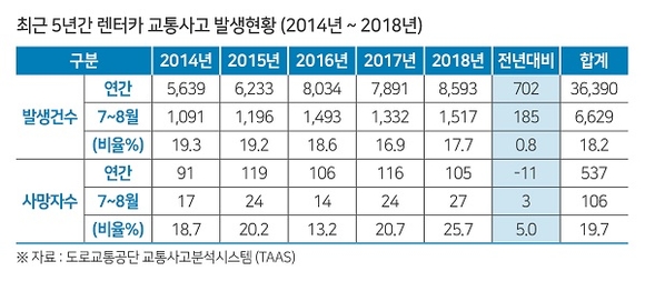 최근 5년간 여름 휴가철(7~8월) 렌터카 교통사고는 6,629건이 발생했으며 사망자는 106명으로 연간 렌터카 교통사고 사망자의 19.7%를 차지하고 있다. 지난해 역시 185건 늘어난 1,517건이 발생하고 사망자는 3명이 더 늘어나서 27명이 사망했다.