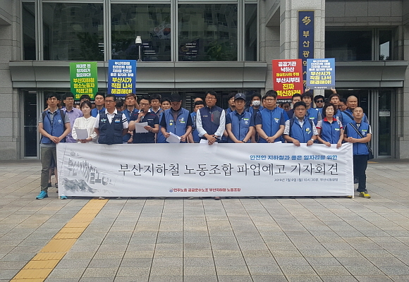 부산지하철노조는 8일 오전 부산시청 앞에서 교섭 결렬 시 총파업 돌입 예고 기자회견을 열고 부산시와 부산교통공사에 ‘좋은 일자리’와 공공성 확보, 안전 인력 확충 등을 요구하고 나섰다.