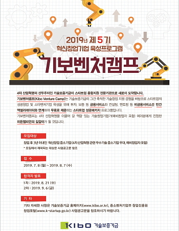 기술보증기금(기보)이 4차 산업혁명을 이끌 역량 있는 혁신 창업기업 육성을 위해 ‘제5기 기보벤처캠프’ 참여기업을 내달 7일까지 모집한다고 8일 밝혔다.