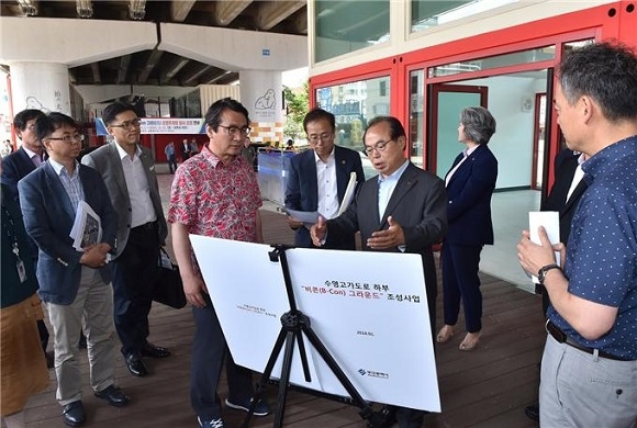 오거돈 시장은 지난 8일 정책투어에 앞서 수영고가로 하부에 조성하고 있는 복합 생활문화 공간 ‘B-Con 그라운드’와 수영구 스포츠문화타운을 들러 시설을 점검했다.