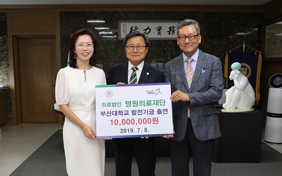 부산대학교는 8일 오후 교내 본관 5층 총장실에서 의료법인 명원의료재단이 부산대 발전 지원을 위해 1천만 원의 발전기금을 출연했다고 밝혔다. 이날 출연식에는 명원의료재단 박정미 이사장과 파인힐병원 김진목 병원장 부부가 나란히 참석해 전호환 부산대 총장에게 발전기금을 전달했다. 한편 울산 울주군에 위치한 파인힐병원은 명원의료재단에 소속된 암재활중점치료병원이다.