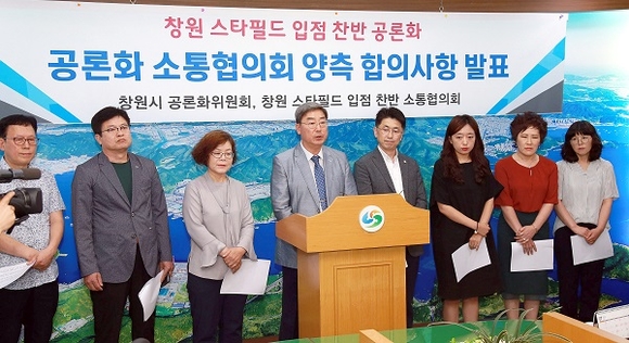 창원시 공론화위원회 어석홍 위원장은 소통협의회 양측 대표들과 함께 9일 오후 시청 프레스센터에서 기자회견을 갖고 공론화 소통협의회 양측 합의사항에 대해 발표했다.