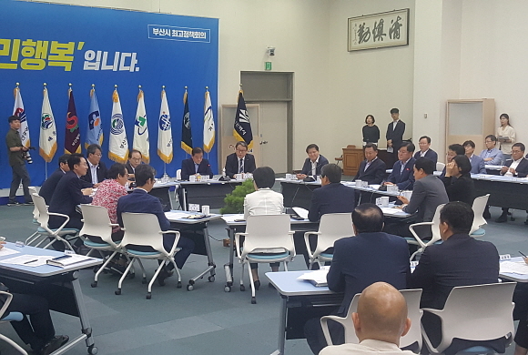 부산시가 지난 9일 오후 시청 1층 대회의실에서 오거돈 시장의 주재 아래 ‘제2회 부산시 최고정책회의’를 열었다. 이날 13개 자치구 구청장이 참석해 시책에 대한 의견을 주고받았다.