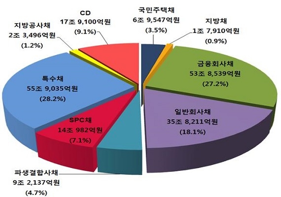 채권 종류별 등록발행 비중은 ▲특수채 28.2% ▲금융회사채 27.2% ▲일반회사채 18.1% ▲CD 9.1% ▲SPC채 7.1% ▲파생결합사채 4.7% ▲국민주택채 3.5% ▲지방공사채 1.2% ▲지방채 0.9% 순이다.