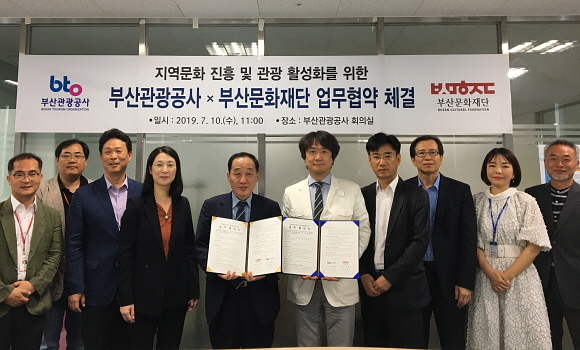 부산관광공사와 부산문화재단이 10일 부산관광공사 회의실에서 ‘지역 문화를 활용한 관광 활성화 사업 추진’을 위한 협약을 체결했다고 밝혔다.