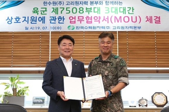 한국수력원자력 고리원자력본부는 10일 본관 3층 접견실에서 육군 제7508부대 3대대와 재난대응 상호지원에 관한 업무협약(MOU)을 체결했다.