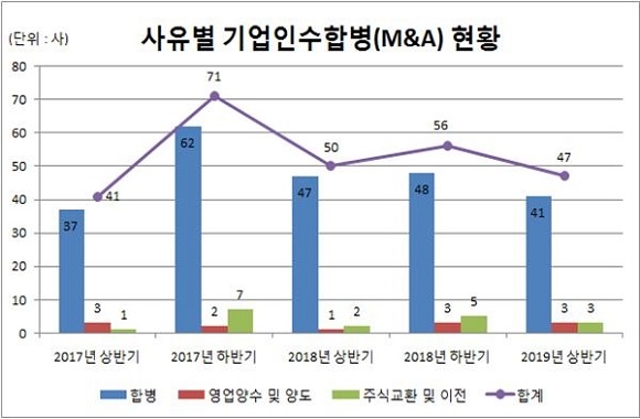 사유별로는 합병이 전년동기대비 6개사 감소한 반면 영업 양수·양도, 주식 교환 및 이전이 각각 전년동기대비 2개사, 1개사 늘어났다.