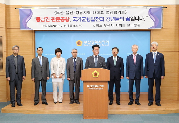 부산·울산·경남·제주지역 대학교 총장협의회는 11일 오후 1시 30분 부산시의회 브리핑실에서 부·울·경 동남권 수요에 맞춘 안전과 편의, 경제 활력을 담보할 관문공항 건설을 희망하는 성명서를 발의했다.