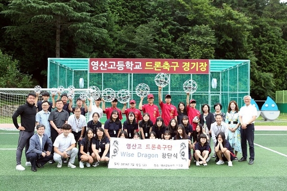 부산 해운대구 반송동에 위치한 영산고등학교는 지난 12일 교내 드론축구 전용경기장에서 교직원과 학부모, 학생대표가 참석한 가운데 부산지역 고등학교로는 최초로 영산고 드론축구단인 ’와이즈 드래곤(Wise Dragon)’을 창단했다.