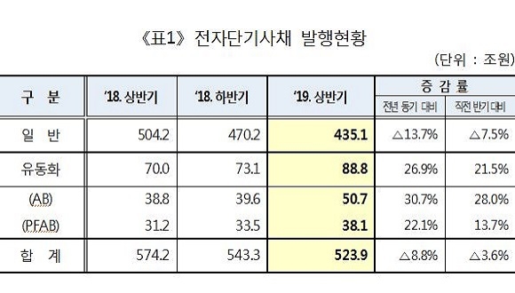 일반 전자단기사채의 발행량은 435조 1000억원으로 전년동기대비 13.7%(69조 1000억원) 감소했다. 반면 유동화 전자단기사채의 발행량은 88조 8000억원으로 전년동기대비 26.9%(18조 8000억원) 증가했다.