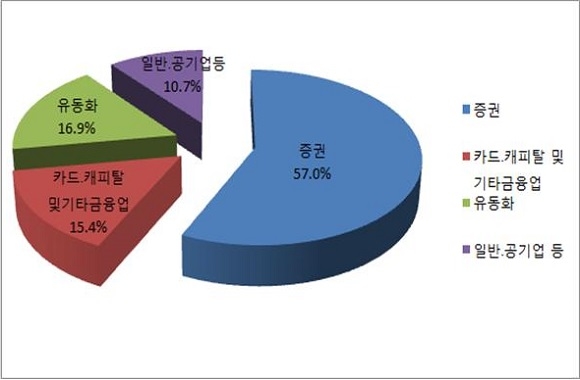 업종별로는 증권회사가 298조 4000억원으로 가장 비중이 컸으며 유동화회사 88조 8000억원, 카드·캐피탈·기타 금융업 80조 8000억원, 일반기업·공기업 등 55조 9000억원 순으로 나타났다.