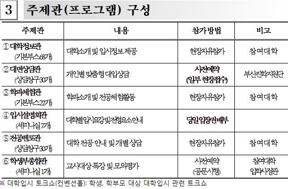 주제관은 ▲대학정보관(71개 전국 주요대학 입학처 관계자가 수시모집 전형 안내, 개별 상담 진행) ▲대면상담관(시교육청 진학지원단 전문위원들이 내년도 수시전형 대비 대면상담 진행) ▲입시설명회관(48개 대학의 입시설명회가 릴레이로 진행) ▲학과체험관(부산지역 21개 대학이 전공 관련 정보, 체험활동 제공) ▲학생부종합관(교사 대상 학생부종합전형 관련 특강 진행) ▲전공멘토관(30개 주요 학과 재학생이 전공 멘토로 참여)이 있다.
