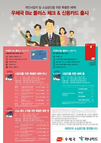 또 하나카드와 제휴해 우체국 전용 신용카드로 출시하는 ‘우체국 Biz플러스 신용카드’는 우편서비스 7%, 쇼핑·통신·보안업체 5%, 아파트 관리비 5% 할인과 해외 결제금액의 5% 등 이용실적에 따라 월 최대 60,000원의 할인 혜택을 받을 수 있다.