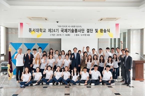 동서대학교 국제기술봉사단 학생 32명이 16일 U-IT관 6층 로비에서 ‘국제기술봉사단(Tech. Corps)’ 결단 및 환송식을 가졌다.