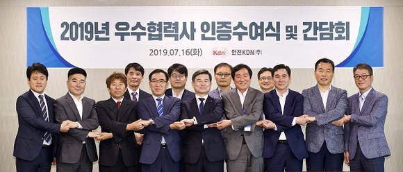 한전KDN은 16일 본사 대회의실에서 ‘2019년도 우수협력사’로 선정된 8개 중소기업들을 대상으로 우수협력사 인증패를 수여하고 간담회를 개최했다.