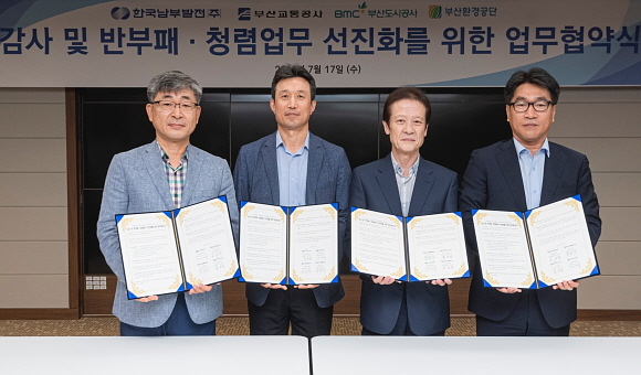 남부발전은 17일 부산국제금융센터(BIFC) 35층 비전룸에서 부산교통공사, 부산도시공사, 부산환경공단과 ‘감사, 반부패, 청렴 업무 선진화 위한 업무협약’을 맺었다고 17일 밝혔다.