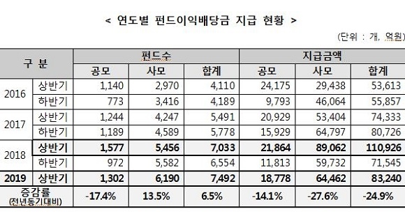 예탁결제원 자료에 따르면 올 상반기 지급된 펀드이익 배당금 8조 3240억원은 지난해 상반기 대비 24.9%(2조 7686억원) 감소한 수치다.