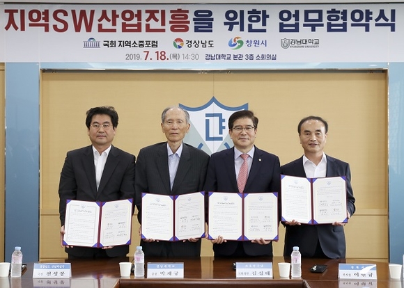 먼저 본관에서 열린 업무협약식에는 국회 지역소중포럼과 경남도·창원시·경남대 등 4개 기관이 참여해 ▲지역 소프트웨어 산업 육성을 위한 법령 제정 및 개정 ▲지역 소프트웨어 인재 양성을 위한 협력 및 지원 등에 대한 협약을 체결했다.