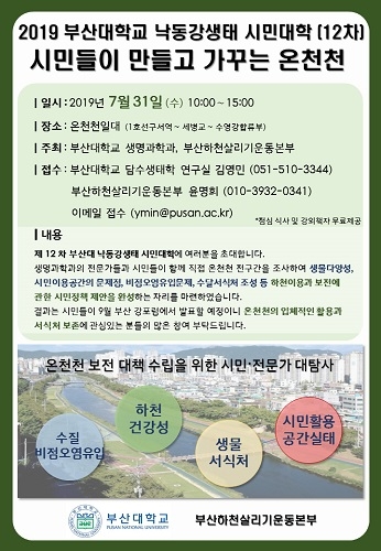 부산대학교 생명과학과는 ‘시민들이 만들고 가꾸는 온천천’을 주제로 「제12차 2019 부산대학교 낙동강 생태 시민대학」을 오는 31일 오전 10시부터 오후 3시까지 온천천 일대에서 개최한다고 22일 밝혔다.