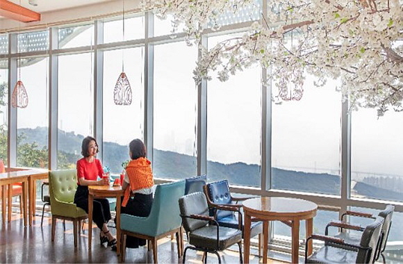 부산 황령산전망쉼터 카페에서 방문객들이 수박 주스와 스무디를 즐기고 있다. 부산관광공사는 무더운 여름철 시민과 관광객을 위해 황령산전망쉼터 카페에서 수박 주스와 스무디를 출시해 판매하고 있다고 전했다. 쉼터에는 무더위를 피해 일몰 이후에 방문한 고객의 메시지를 신청받아 동영상으로 구현되는 미디어 포토존을 송출하는 서비스도 제공하고 있다. (사진=부산관광공사 제공)