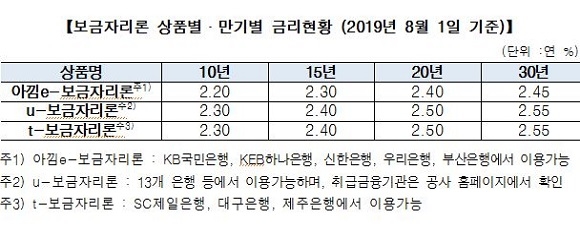 이에 공사 홈페이지에서 신청하는 ‘u-보금자리론’과 은행 창구에서 신청하는 ‘t-보금자리론’은 대출 만기에 따라 연 2.30%(10년)에서 2.55%(30년)로 이용할 수 있다.