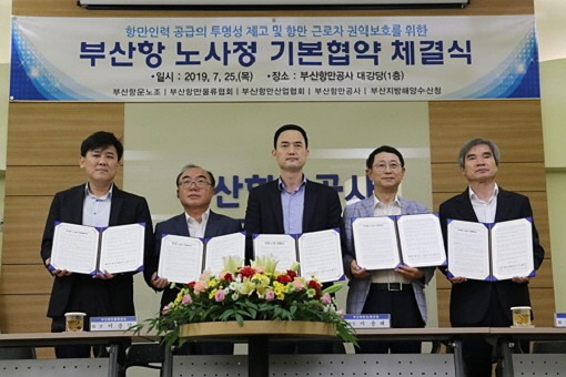 부산지방해양수산청, 항운노조, BPA, 항만물류협회, 항만산업협회가 25일 오전 10시 부산항만공사(BPA) 대회의실에서 항만 근로자를 위한 노사정 기본협약을 체결했다.