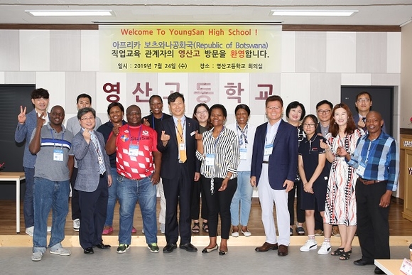 부산 해운대구에 위치한 특성화고 영산고등학교는 지난 24일 아프리카 보츠와나공화국(Republic of Botswana)의 직업교육분야 대표인 도르카스 피리에 교육부 관계자 일행이 학교를 방문해 실습실을 둘러보는 특별한 행사를 진행했다.