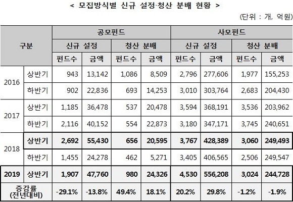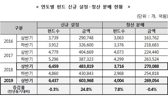 한국예탁결제원이 2019년도 상반기 펀드 신규 설정 및 청산 분배 현황 자료를 26일 발표했다.
