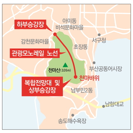 사업은 내년 하반기 착공해 오는 2022년 12월 완공을 목표하고 있다. 사업의 핵심은 천마산 일대에 복합전망대와 이곳으로 가는 부산 최초의 관광 모노레일을 설치하는 것이다.