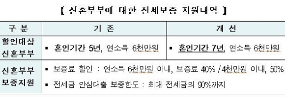 기존에는 혼인 기간이 5년 이내이며 부부합산 연소득 6000만원 이하인 신혼부부에 대해 ‘전세금 반환보증’ 보증료를 40% 할인했으나 이번 조치로 혼인 기간이 7년 이내인 신혼부부도 보증료 할인 대상에 포함됐다.