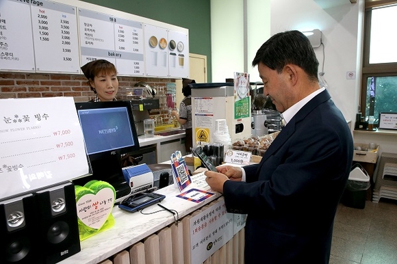 김해시의 제로페이 결제 릴레이 챌린지 첫 주자인 허성곤 김해시장이 지난 10일 시청사 내 한 카페에서 제로페이로 결제하고 있다. (사진=김해시 제공)