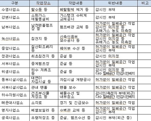 시에서 지적한 주요 사항으로는 ▲밀폐 공간 작업 진행 전 관리감독자 허가 없이 작업 진행 ▲밀폐 공간 작업 시 감시인 미지정 또는 외근직으로 감시인 대리 수행 ▲밀폐 공간 작업 전 유해가스 농도 측정 미시행 등이다.