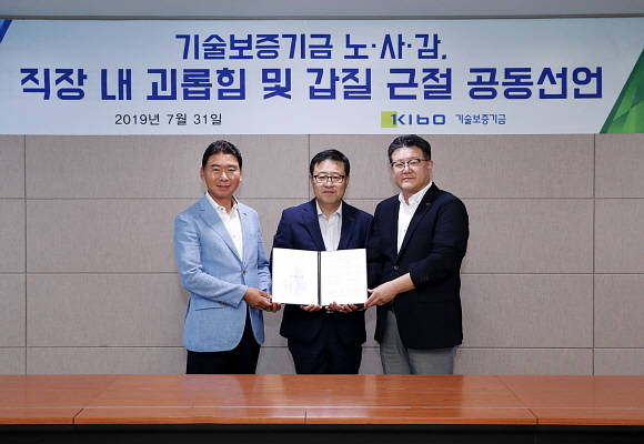 기술보증기금(기보)이 일명 ‘직장 내 괴롭힘 방지법’으로 불리는 개정 근로기준법이 지난 16일 시행됨에 따라 31일 부산 본점에서 ‘직장 내 괴롭힘, 갑질 근절 위한 노·사·감 공동선언식’을 열었다고 밝혔다.