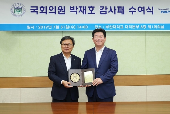 부산대학교는 31일 오후 박재호 국회의원(더불어민주당, 부산 남구을)에게 대학 발전에 기여한 공로를 기념하고 고마움을 전하는 감사패를 전달했다.