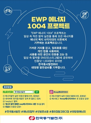 한국동서발전은 에너지 절약에 대한 동기를 부여하고 효과적인 행동 기부 문화를 조성하기 위한 ‘ewp 에너지 1004’ 캠페인을 시행하고 있다고 밝혔다.