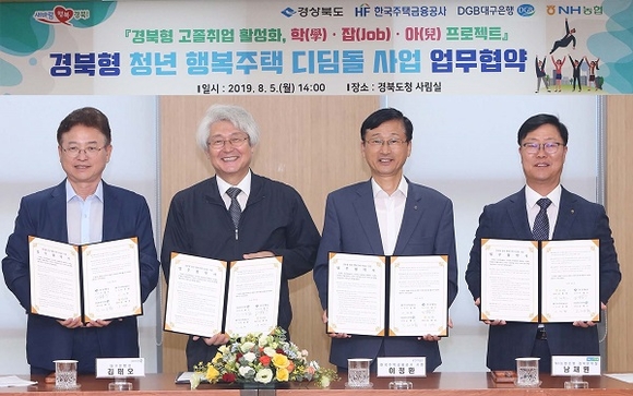 DGB대구은행은 5일 오후 경북도청에서 고졸 경상북도 도민 중소기업 취업청년의 주거안정 금융지원 도모를 위해 경상북도, 한국주택금융공사와 ‘청년 행복주택 디딤돌사업 업무협약’을 체결했다.