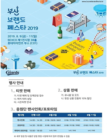 롯데 자이언츠가 오는 9일부터 11일까지 부산시 해운대구 벡스코에서 열리는 2019 부산브랜드페스타에 참가한다.