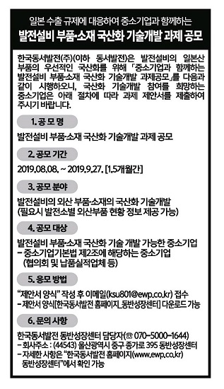 한국동서발전은 8월 8일부터 9월 27일까지 중소기업을 대상으로 ‘발전설비 소재 및 부품 국산화를 위한 기술개발 과제 공모’를 시행한다.