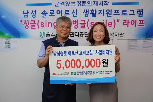 한국수력원자력 새울원자력본부는 8일 부산 기장군에 위치한 요리학원에서 지역 어르신 및 관계자 등이 참석한 가운데 울주군 남부노인복지관에서 운영하는 ‘싱글벙글 라이프’ 프로그램 지원을 위한 사업비 500만원을 전달했다.
