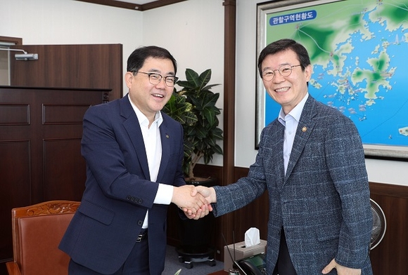 허성무 창원시장은 9일 오전 창원 마산지방해양수산청에서 문성혁 해양수산부 장관을 만나 현안사업 지원을 건의했다. 문 장관은 경남지역 현장 방문차, 첫 일정으로 마산해양수산청에 들렀다.