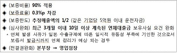 일본 수출규제로 인한 피해(예상) 기업에 기존 보증의 만기 연장을 확대할 계획이다. 또 자체 재원 등을 기반으로 일본 수출규제 피해기업에 긴급 유동성 자금을 지원하기 위한 2000억원 규모의 특별보증 프로그램을 신설한다.