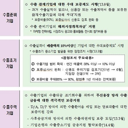 미-중 무역 분쟁 등 불확실한 세계정세 속에서 수출 애로를 겪는 중소기업의 활력을 제고하기 위해 3000억원 규모로 보증을 확대 공급한다. 기업 보증 한도를 기존 30억원에서 70억원으로 늘렸다. 이는 ▲수출준비기업 ▲수출초기기업 ▲수출주력기업으로 분류해 각각 지원한다.