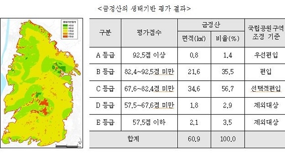 금정산의 경우 생태계 보전과 역사문화 자원이 다양해 국립공원 5가지 지정 기준인 ▲자연 생태계 ▲자연경관 ▲문화경관 ▲지형 보존 ▲위치, 이용 편의를 충족하고 있다고 부산연구원은 판단했다.