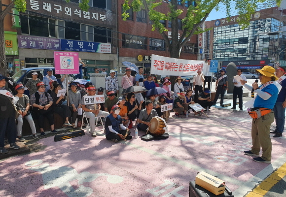 13일 오전 10시 30분 부산시 동래 온천2구역 주민들이 동래구청 앞에서 제4차 집회를 열고 현대산업개발의 온천 2구역 주택재개발정비 공사로 주민들이 소음, 분진, 안전 위협 등의 피해를 받고 있다며 피해 보상을 촉구하고 있다. (사진=변옥환 기자)