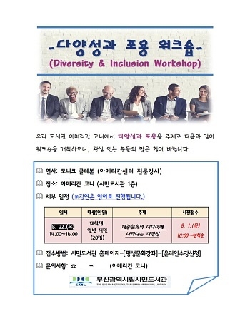 부산시립시민도서관이 오는 22일 오후 2시부터 시민 20명을 대상으로 ‘다양성과 포용’을 주제로 주한미국대사관 연사 초청 워크숍을 연다고 13일 밝혔다.