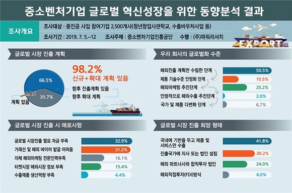외부 전문기관에서 수행한 설문조사의 주요내용은 중소벤처기업의 해외진출 수요, 해외진출 시 애로사항 등 13개 문항으로 구성돼 있으며 설문조사를 분석한 결과 응답자의 98.2%가 글로벌 시장에 신규진출 또는 확대할 의향이 있다고 답했다.