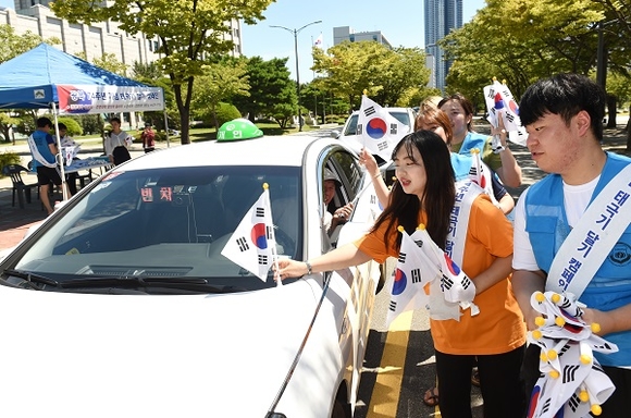 이들은 이날 부스에 차량용 태극기를 비치하고 대학에 드나드는 차량에 직접 태극기를 부착하거나 대학을 방문하는 시민들을 대상으로 태극기를 나눠주며 광복절 태극기 달기를 독려했다.