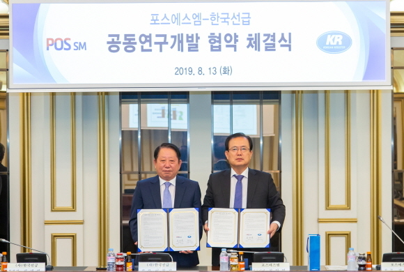 한국선급이 포스에스엠(POS SM)과 선박 디지털 서비스 공동연구 협약을 체결하고 포스에스엠의 이산화탄소 배출 관리 IT 솔루션에 인증서를 수여했다고 13일 밝혔다.